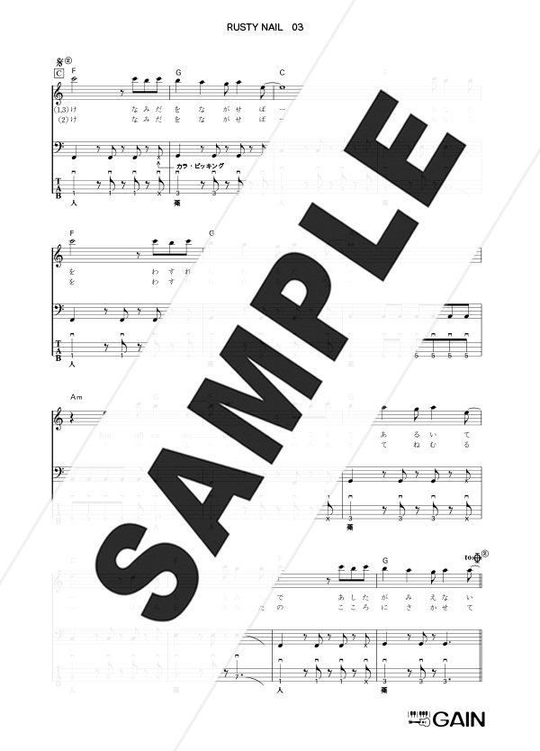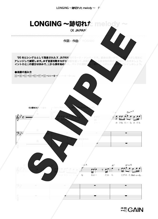 X JAPAN 1995年のバラード・ナンバー。オリジナルはかなり長いので、短くアレンジしています。ピッキング方法と、弦の押さえ方、音を止めるテクニックなど、どれもごく基本的な弾き方を練習します。 |