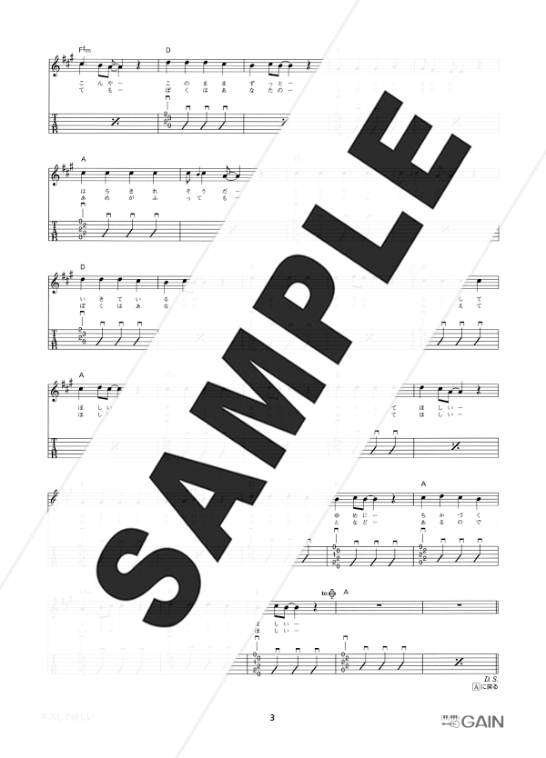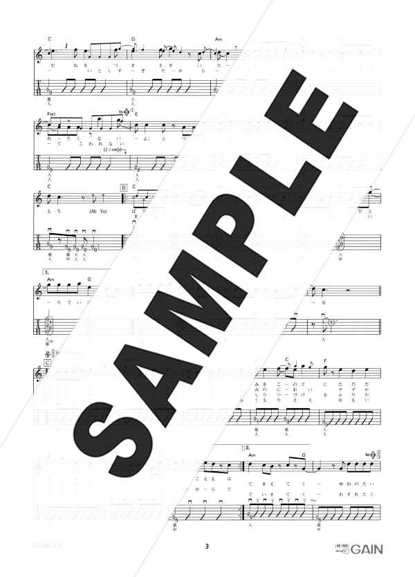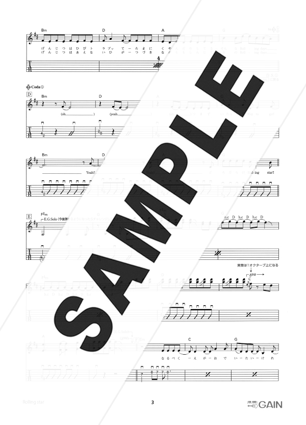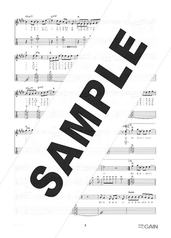 | ギター1本のコードストローク・バッキングで弾き語りが超盛り上がる曲。イントロのディレイを使ったリードプレイの解説もついている。演奏+解説動画はYouTubeにて公開中です | ||