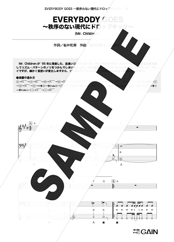 Mr.Childrenが1995年に発表した、泥臭いロックンロール・タイプのナンバーです。16分音符のシンコペーションを活用したパターン・プレイを練習します。 |