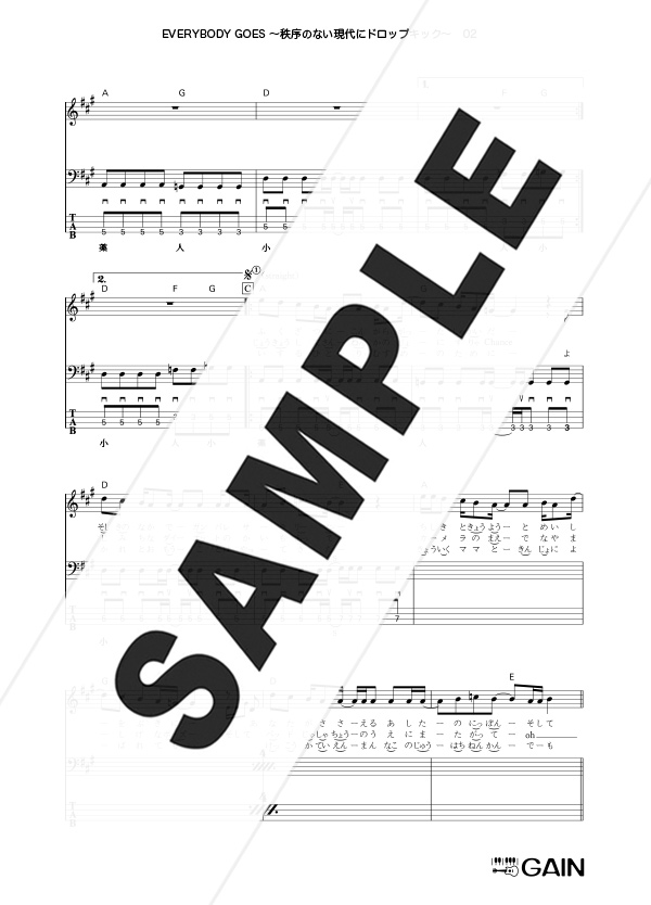 キャッチーなメロディー・ラインと軽快なリズムが印象的な、JUDY AND MARYの代表曲のひとつです。アップ・テンポでの4分音符のリズム・ワークと、開放弦のフィンガー・カットを練習します。 |
