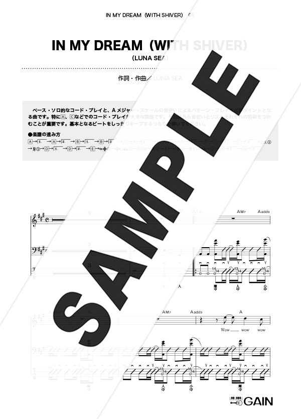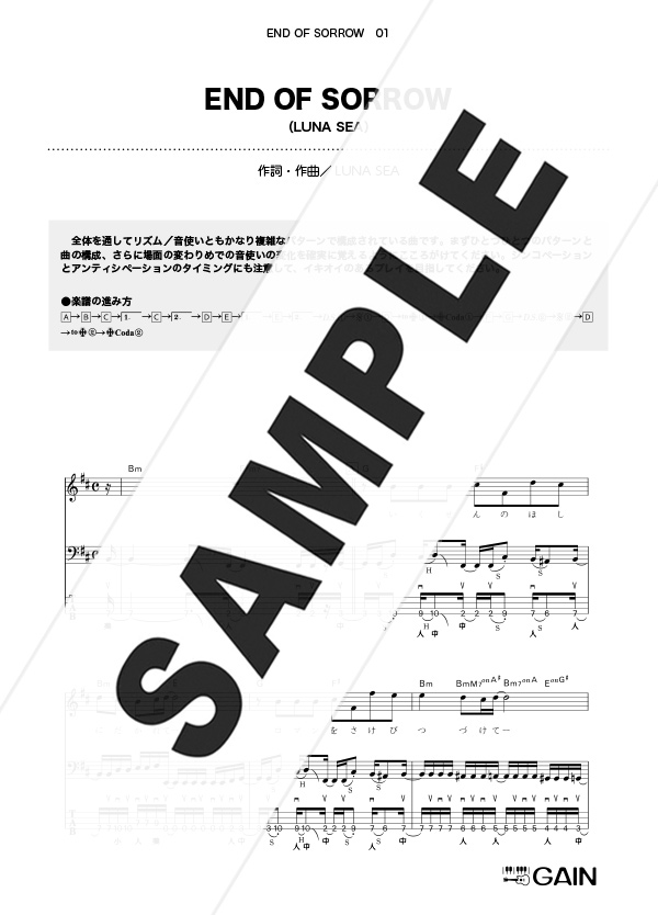 LUNA SEA 1996年リリースのシングル・ナンバー。全体を通してリズム/音使いともかなり複雑なパターンで構成されている曲です。特に16分音符のアンティシペーションがポイントになります。 |